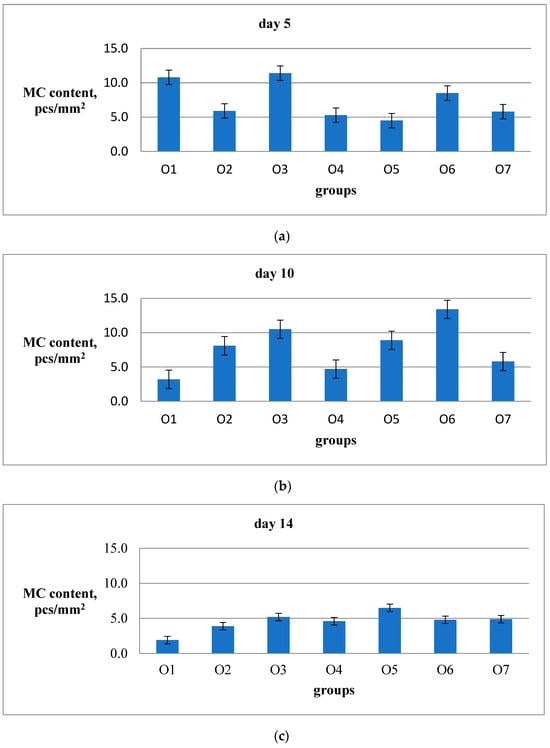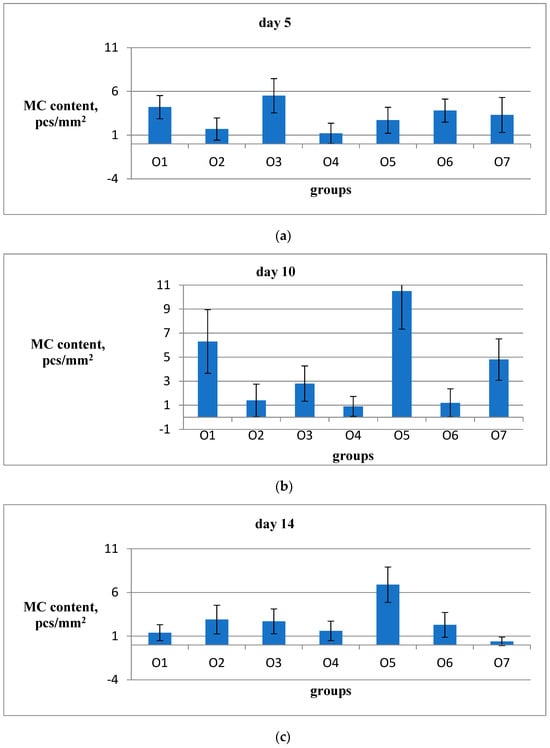 MC number in the wound bottom on the 5th (a), 10th (b), and 14th (c) days is shown. The results are presented in pcs/mm2 using a combined staining method with ammonium silver and toluidine blue. For each group, the average value was calculated based on 20 fields of view from 2 animals. The standard error of the average value for each group on the specified date is represented by the vertical bars.