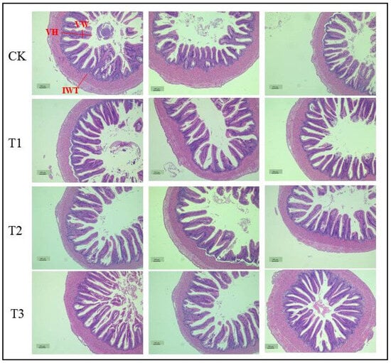 43]. The larger the surface area and density of intestinal villi, the more contact area there is between chyme and the intestine, and the more effectively the animal can absorb nutrients in the feed. The increase in IWT can increase the elasticity of the intestinal tract and promote the movement of feed in the intestine [