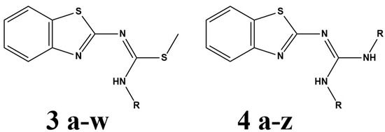 General chemical structure of 2-aminobenzothiazole derivatives linked to different isothioureas (3a–w) or guanidines (4a–z).