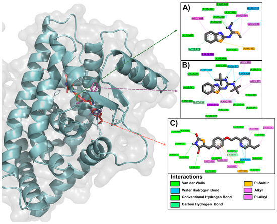Binding mode and type of interaction presented between ligands 3b (A), 4y (B), and PGZ (C) with PPARγ (ID code 2PRG; https://www.rcsb.org/structure/2PRG, accessed on 15 November 2022) [78,79]. Molecular docking analysis was performed by Molegro Virtual Docker Version MVD 2019 7.0 (http://molexus.io/molegro-virtual-docker/, accessed on 1 December 2022) [77], whereas the binding mode and type of interaction were visualized by Drug Discovery Version 20.1.0.19295 (https://www.3ds.com/products/biovia/discovery-studio, accessed on 16 December 2022) [83] and PyMOL Version 3.1 (https://www.pymol.org/, accessed on 22 December 2022) [84].