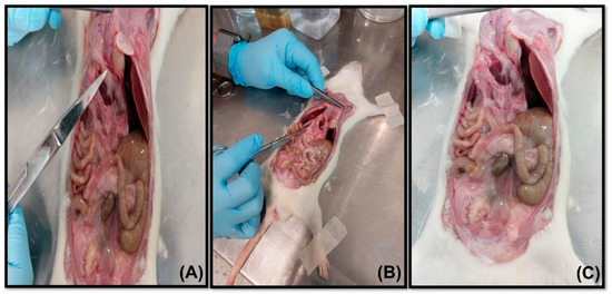 Figure 3 shows the photographs corresponding to the necropsy performed 15 days after the animals were administered compounds 3b and 4y. As can be seen, neither of the two compounds produced obvious macroscopic damage to the organs and tissues of the animals, which presented normal characteristics in terms of size and color (Figure 3B,C) compared to the animal that did not receive treatment and the one that was administered the vehicle (Figure 3A) [87,90,91].