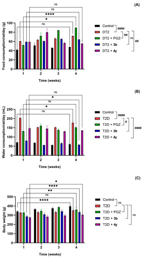 Food consumption (A), water consumption (B) and body weight (C) of T2D animals administered compounds 3b and 4y in equimolar ratio to PGZ (15 mg/kg) for 4 weeks. Data are expressed as mean ± SEM and were analyzed by two-way ANOVA with Tukey’s post-hoc test; n = 6. The graphs represent significant and no significant differences (ns) of each treatment group with respect to time (* week 1 vs. week 4) and between them (# control vs. T2D and # T2D vs. T2D + PGZ, T2D + 3b, or T2D + 4y) at the end of treatment (week 4). * p, # p < 0.1; ** p, ## p < 0.01; **** p, #### p < 0.0001; ns p > 0.05.