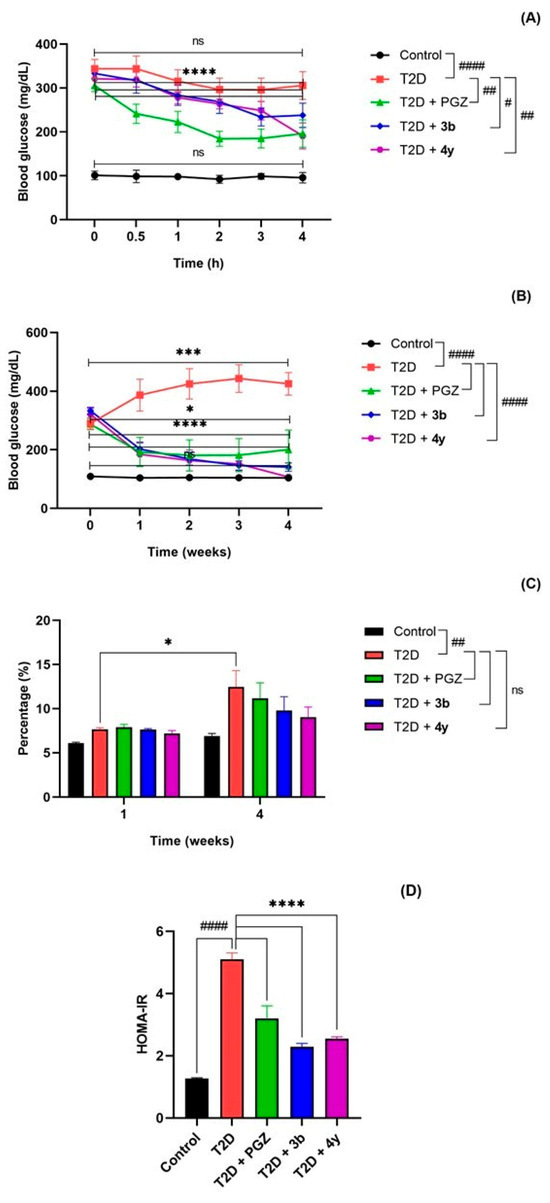 Blood glucose levels in T2D animals administered compounds 3b and 4y in equimolar ratio to PGZ (15 mg/kg) as a single dose (A), with repeated doses for 4 weeks (B), percentage of HbA1c (C), and (D) HOMA-IR index. Data are expressed as mean ± SEM and were analyzed by two-way ANOVA with Tukey’s post-hoc test; n = 6. The graphs represent significant and no significant (ns) differences of each treatment group with respect to time (* 0 h vs. 4 h or * week 1 vs. week 4) and between them (# control vs. T2D and # T2D vs. T2D + PGZ, T2D + 3b or T2D + 4y) at the end of treatment (4 h or week 4). * p, # p < 0.1, ## p < 0.01; *** p < 0.001; **** p, #### p < 0.0001; ns p > 0.05.