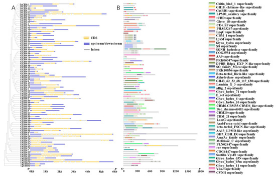 Gene structure and domain analysis of CgCBMs. Note: (A) Exon–intron structures of CgCBMs. (B) Domains of CgCBMs.