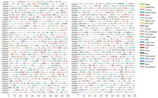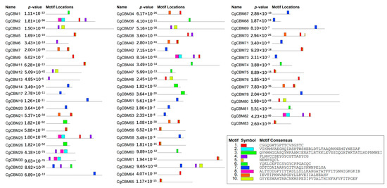 To further delve into the function of CgCBM genes, the Multiple Em for Motif Elicitation (MEME) website was utilized for evaluating the conserved motifs of the CgCBM proteins (Figure 3). The analysis unveiled a total of 10 motifs in the CgCBM proteins (Figure S1). Notably, motif 7 was the most common motif identified in 18 CgCBM proteins. Motif 7 was the only conserved motif in CgCBM14, CgCBM17, CgCBM19, CgCBM20, CgCBM33, CgCBM42, CgCBM51, CgCBM52, CgCBM53, CgCBM58, CgCBM67, CgCBM68, CgCBM69, CgCBM71, CgCBM73, and CgCBM78. Furthermore, CgCBM2, CgCBM25, CgCBM43, and CgCBM82 had common motifs, including motifs 2, 4, 8, and 9, with identical sequence orders observed for CgCBM2 and CgCBM25, as well as for CgCBM43 and CgCBM82. Similarly, motifs 1, 5, and 9 were shared in CgCBM7, CgCBM40, CgCBM55, CgCBM70, and CgCBM77. Consistency of motifs, such as motifs 2, 4, and 8, was observed in CgCBM29 and CgCBM30. Moreover, motifs 1 and 5 were common among CgCBM5, CgCBM11, CgCBM24, CgCBM56, CgCBM59, CgCBM61, CgCBM65, CgCBM72, and CgCBM75 (Figure 3). The similarity of the conserved motifs within the protein groups indicated the potential sharing function among these CgCBMs.