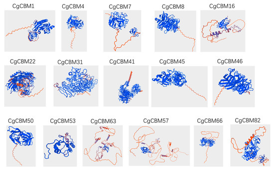 To enhance our understanding of the biological functions of CBMs in C. graminicola, we investigated the secondary structures of all CgCBMs, with random coils being the predominant component. Specifically, the proportions of α-helices varied from 3.91% to 38.28%, β-turns from 0 to 13.45%, random coils from 41.52% to 94.41%, and extended stands from 1.68% to 34.2% (Table S2). Furthermore, we predicted the three-dimensional (3D) protein structures of 16 CgCBMs from all different superfamilies. As illustrated in Figure 4, the 3D structures of these CgCBM proteins displayed significant differences, underscoring the structural diversity inherent in the CgCBM family.