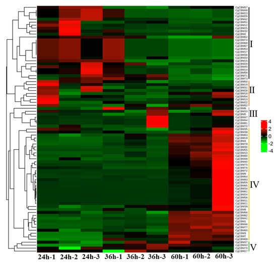In order to clarify the pathogenic mechanism of CgCBM gene family members, the expression levels of the 83 CgCBM genes during infection were analyzed using RNA-seq data [26]. Based on the FPKM values of these genes, a heatmap of the expression profiles at three time points post-inoculation (24 h, 36 h, and 60 h) was constructed (Figure 7). The results reveal that the changes in the 83 CgCBM gene family members could be categorized into five distinct groups according to the changes observed at different time points. Class I comprised 25 genes, which were gradually down-regulated during infection, while Class IV included 38 genes, which were significantly up-regulated after 60 h of inoculation. It is worth noting that nine genes in Class II were initially down-regulated during infection and then up-regulated. There were seven genes in Class III, and four genes in Class V that had low expression levels at 24 h after inoculation with C. graminicola and were moderately up-regulated at 36 h and 60 h. Twelve CgCBM genes from different classes were selected for RT-qPCR verification (Table S5). RT-qPCR results confirmed the accuracy of transcriptome data (Figure 8). These CgCBM gene family members exhibited significant changes in expression patterns during pathogen infection, indicating their potentially pivotal role in pathogenicity.
