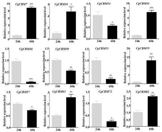 RT-qPCR verification of CgCBM expression pattern. Note: Bars represent mean values of three technical replicates ± SE, Student’s t-test (n = 3, * p < 0.05, ** p < 0.01, *** p < 0.001).