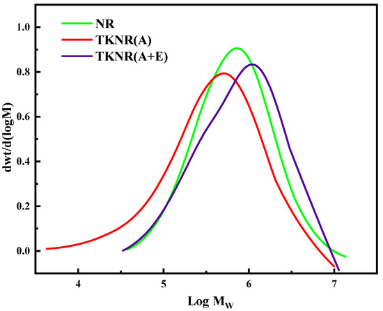 Table 1 presents the molecular weights of NR and TKNR extracted by two methods, along with their molecular weight distributions shown in Figure 3. Comparisons of weight-average molecular weight (Mw), number-average molecular weight (Mn), and polydispersity index (PDI = Mw/Mn) reveal that NR exhibits an Mw of 1.30 × 106, Mn of 4.4 × 105, and a PDI of 3.0, reflecting a broad and relatively uniform molecular weight distribution. In contrast, TKNR extracted by the alkali-based method (A) shows an Mw of 7.0 × 105, Mn of 1.6 × 105, and a PDI of 4.6, indicating a significantly lower molecular weight and a higher PDI. This suggests a broader and less uniform molecular weight distribution, likely due to an increase in low-molecular-weight components resulting from molecular chain degradation during extraction. On the other hand, TKNR extracted by the alkali-assisted enzymatic method (A + E) exhibits an Mw of 1.10 × 106, Mn of 4.1 × 105, and a PDI of 2.5, closer to the values observed for NR. This indicates that enzymatic extraction causes less molecular chain degradation, retains more high-molecular-weight components, and produces a more uniform molecular weight distribution [27].