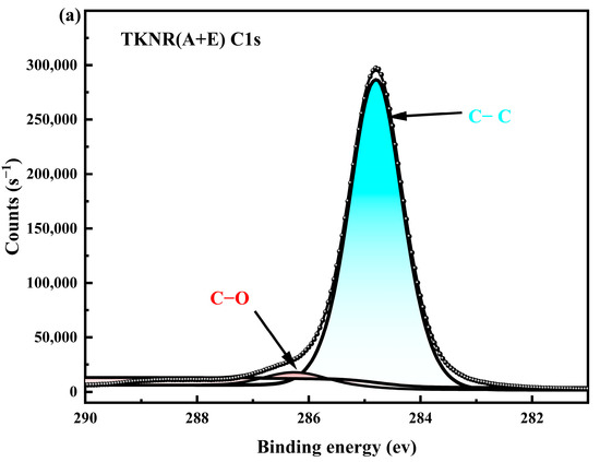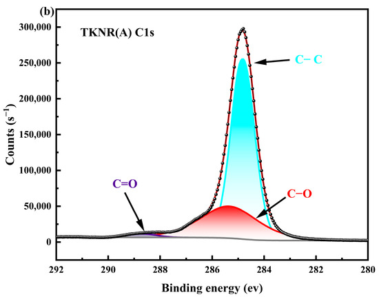 Figure 4 presents the XPS C spectra, highlighting the influence of different extraction methods on the structure and chemical composition of TKNR. In Figure 4a, the C−C main peak at 285.0 eV for TKNR extracted via the alkaline–enzyme method aligns closely with that of NR, indicating effective preservation of the polyisoprene backbone structure. Additionally, the C−O secondary peak is relatively minor, and the C=O peak is nearly absent in the alkaline–enzyme sample, suggesting minimal formation of oxidation products during extraction. This indicates that the mild conditions of the alkaline–enzyme method effectively reduce molecular chain oxidation and degradation, preserving the chemical purity and structural integrity of TKNR [28].