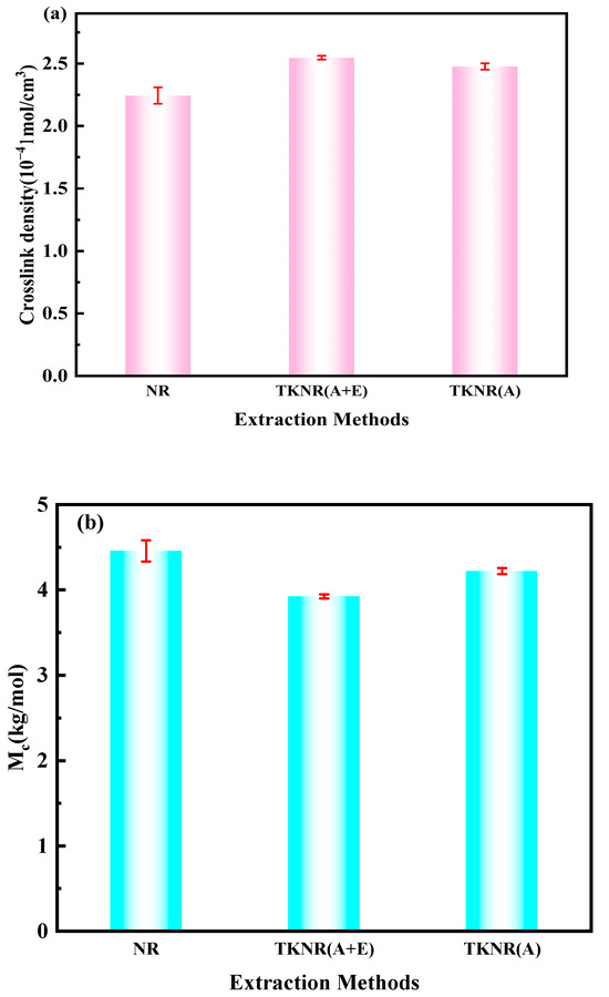 Figure 5 illustrates the crosslink density and molecular weight between crosslinks (Mc) for NR and TKNR. Figure 5a,b depict the influence of various extraction methods on the crosslink network structures of TKNR and NR. The crosslink density (ν) of NR is measured at 2.24 × 10−4 mol/cm3, which is significantly lower than that of TKNR extracted via the alkaline–enzymatic method (2.55 × 10−4 mol/cm3) and the alkaline method (2.48 × 10−4 mol/cm3). This observation indicates that both extraction methods result in TKNR exhibiting a higher crosslink density compared to NR.