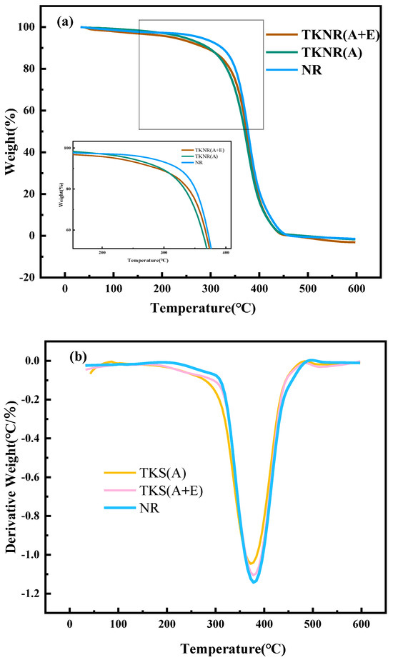 Thermal stability of NR and TKNR: (a) TG; (b) DTG.