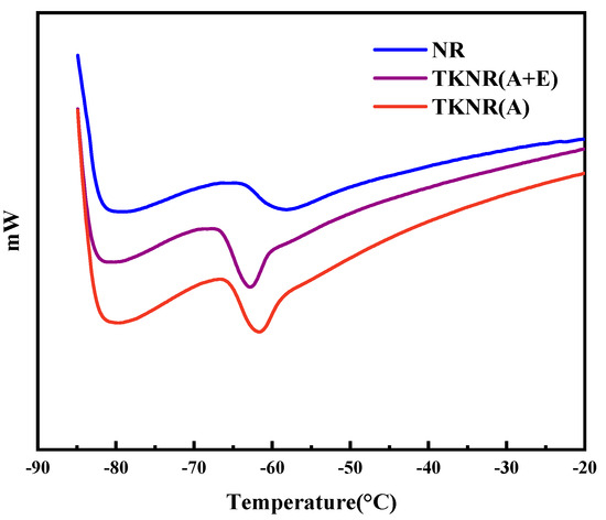 Figure 7 illustrates the differential scanning calorimetry (DSC) curves for NR, TKNR (A), and TKNR (A + E). The DSC curves highlight the effects of various extraction methods on the glass transition temperature (Tg) and crystallinity of the samples. NR exhibited the highest glass transition temperature (Tg is −56.88 °C), indicating its relatively high molecular chain rigidity. In contrast, TKNR (A) (−60.94 °C) and TKNR (A + E) (−62.29 °C) demonstrated lower Tg values, with TKNR (A + E) showing the lowest Tg. This result suggests that enzymatic treatment reduces the rigidity of molecular chains and enhances their toughness.