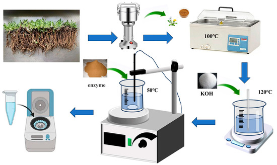 The filtered residue was dried at 50 °C for 24 h, and the collected filtrate, rich in inulin, was recovered by spray drying at 150 °C until completely dried. The dried residue was weighed, and KOH was added at a ratio of 60 mg KOH per gram of dry root, dissolved in 500 mL of deionized water. This mixture was treated at 120 °C for 30 min, then filtered (80 mesh sieve), and lignin was precipitated by acidifying the filtrate. The residue was subsequently washed with 5 L of deionized water, followed by an additional 2 L, and allowed to stand at 4 °C overnight to remove residual alkali ions. After further filtration and washing, the residue was suspended in 1.5 L of deionized water, and pectinase and cellulase were added at a 1.5:1 ratio (42 mg pectinase (500 U/mg) and 27.5 mg cellulase (400 U/mg) per gram of dry root). The pH of the mixture was adjusted using 0.5 M sodium citrate buffer (pH 5.5). The mixture was then sealed in a beaker and stirred magnetically at 50 °C and 200 rpm for 48 h.