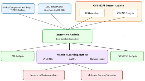 This study applies network pharmacology and bioinformatics methods to explore the molecular mechanisms of six medicinal food homologous plants in colorectal cancer therapy. Active components and targets were identified from the Traditional Chinese Medicine Systems Pharmacology Database and Analysis Platform (TCMSP) [31] and integrated with gene expression profiles from the Gene Expression Omnibus (GEO) database [32]. Comprehensive analyses, including protein–protein interaction networks, pathway enrichment, machine learning techniques, and immune infiltration evaluations, revealed the synergistic effects of these herbs. Advanced methods like Least Absolute Shrinkage and Selection Operator (LASSO) regression [33], Support Vector Machine-Recursive Feature Elimination (SVM-RFE) [34], and Random Forest (RF) [35] were used to pinpoint robust therapeutic targets and biomarkers.