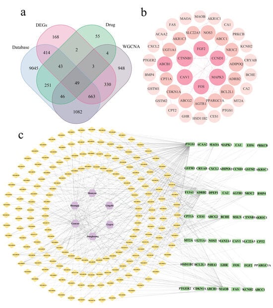 Using the TCMSP database, 303 active components and 453 drug targets were identified from six medicinal food homologous plants (Supplementary Tables S1 and S2). A total of 11,593 CRC target genes were obtained from public databases such as GeneCards, OMIM, and TTD (Figure 2a). Differential expression analysis of the GSE41258 dataset identified 1672 differentially expressed genes, which we visualized using a heatmap and volcano plots (Figure 2b,c; Supplementary Table S2). Using the GSE41258 dataset, gene co-expression networks were constructed via Weighted Gene Co-expression Network Analysis (WGCNA) to identify CRC-related key gene modules. The soft threshold was determined to be 7 (Figure 2d,e) through the evaluation of scale independence and mean connectivity patterns. The gene co-expression network analysis incorporated hierarchical clustering and dynamic tree-cutting algorithms to identify distinct modules. The integration of similar modules yielded 12 unique gene clusters, visualized through a dendrogram (Figure 2f). Among these, the brown, blue, and pink modules demonstrated robust correlations with CRC/non-CRC phenotypes (Figure 2g). Statistical evaluation revealed strong positive associations between Gene Significance (GS) and Module Membership (MM) metrics across CRC-related genes in these three modules (Figure 2h–j). The genes from the three modules were merged to obtain WGCNA results (Supplementary Table S2). Through intersection calculation, 49 potential therapeutic targets were identified (Figure 3a). These results suggest that these six herbs may act synergistically through multiple active components on multiple targets.
