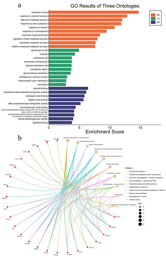 Gene ontology (GO) enrichment analysis (Figure 4a) demonstrated that the target genes were predominantly linked to biological processes (BP), including drug response, fatty acid metabolism, alcohol response, and hormone response. Cellular component (CC) categories included the apical part of cells, caveolae, membrane rafts, endoplasmic reticulum lumen, outer mitochondrial membrane, and microvilli. Molecular function (MF) terms highlighted steroid binding, xenobiotic transmembrane transport, monocarboxylic acid binding, and various dehydrogenase activities. Kyoto Encyclopedia of Genes and Genomes (KEGG) pathway enrichment analysis (Figure 4b) revealed significant involvement in cancer-related pathways, including colorectal cancer and other oncogenic pathways, consistent with the established mechanisms of CRC pathogenesis.