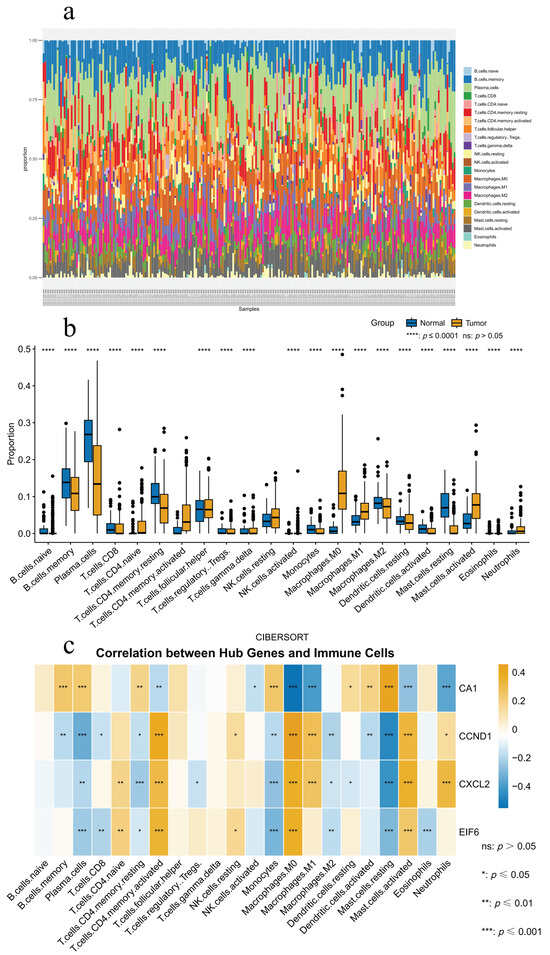 CIBERSORT analysis identified significant variations in immune cell profiles between colorectal cancer and normal tissues (Figure 6a,b). Tumor tissues showed a significant decrease in adaptive immune cells, including plasma cells and memory B cells, accompanied by an increase in activated CD4+ memory T cells and a reduction in resting CD4+ memory T cells. Among innate immune cells, M0 and M1 macrophages exhibited higher infiltration levels, while mast cells showed polarization, characterized by fewer resting cells and an increase in activated cells.