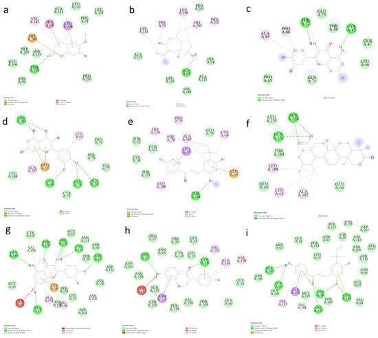 Interaction map of the docking results of the target hub proteins and their corresponding ligand molecules. (a) CA1_MOL000040, (b) CA1_MOL000960, (c) CXCL2_MOL000098, (d) CCND1_MOL000098, (e) CCND1_MOL000497, (f) CCND1_MOL000511, (g) EIF6_MOL000098, (h) EIF6_MOL000390, (i) EIF6_MOL000497.