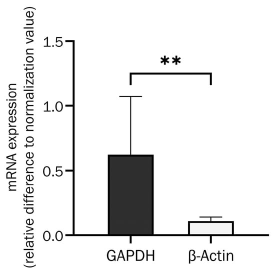 Comparison of housekeeping gene mRNA expression variance when osteoblasts stimulated with IL-6 (250 U/mL), IL-8 (100 U/mL and 25 U/mL), and their inhibitors (MA5-23698 at 0.1 µg/mL and Reparixin L-lysine salt at 100 nM) (unpaired t-test with Welch’s correction, t = 3.419, df = 8.083, p = 0.009 (**), n = 10).
