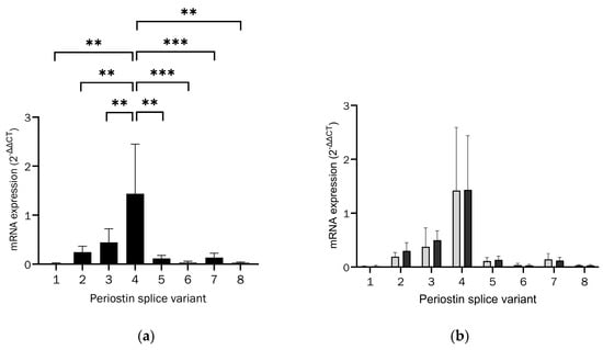 Periostin splice variant expression in osteoblasts was conducted using primers established by Cai et al. []. The expression pattern is shown in Figure 2a. The full set of data points can be seen in Figure S1a.