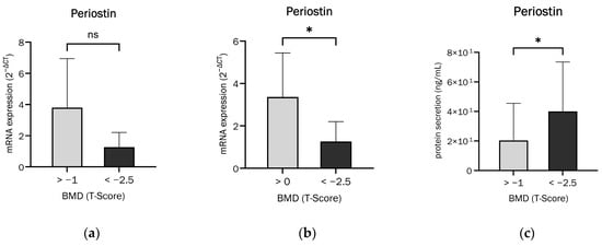 (a) Comparison of Periostin mRNA expression (relative to housekeeping gene) between normal bone density and osteoporosis patients (unpaired t-test with Welch’s correction, t = 2.034, df = 7.065, p = 0.081 not significant (ns), n = 14). (b) Comparison of Periostin mRNA expression (relative to housekeeping gene) between patients with T-Score > 0 and <−2.5 (unpaired t-test, t = 2.378, df = 10, p = 0.0388 (*), n = 12). (c) Comparison of Periostin secretion between normal bone density and osteoporosis patients (Mann–Whitney test, U = 27, p = 0.0281 (*), n = 22).