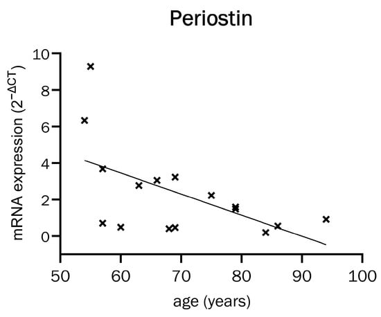 Periostin mRNA expression in relation to patient age (simple linear regression, y = −0.04480x + 4.029, R2 = 0.3199, p = 0.0224, n = 16).