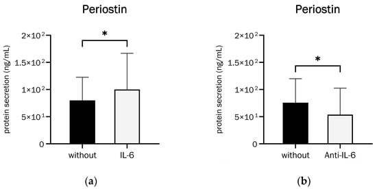 Effect of (a) IL-6 (250 U/mL) and (b) anti-IL-6 (MA5-23698 at 0.1 µg/mL) on Periostin secretion in 21-day-differentiated osteoblasts ((a): Wilcoxon matched-pairs signed rank test, p = 0.0425 (*), n = 12, (b): Wilcoxon matched-pairs signed rank test, p = 0.0134 (*), n = 14).