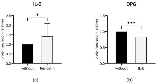(a) Effect of Periostin (100 ng/mL) on IL-6 secretion in 21-day-differentiated osteoblasts (Wilcoxon matched-pairs signed rank test, p = 0.0479 (*), n = 13). (b) Effect of IL-6 (250 U/mL) on OPG secretion in 21-day-differentiated osteoblasts (Wilcoxon matched-pairs signed rank test, p = 0.0004 (***), n = 14).