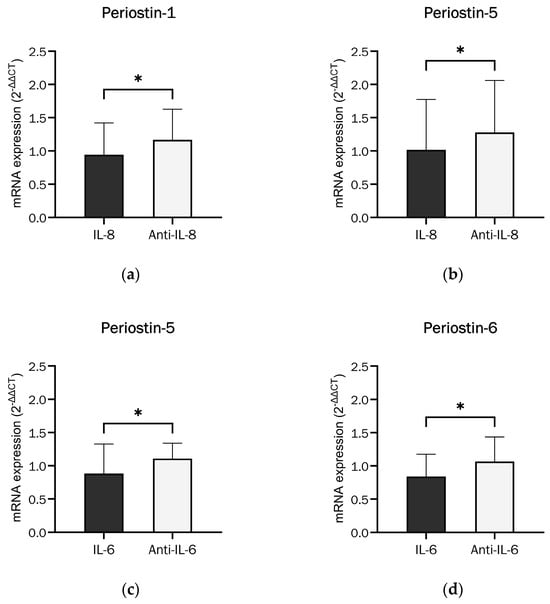 Individual splice variants were differentially expressed if IL-6 or IL-8 and the corresponding inhibitor were added, as shown in Figure 7. Periostin-1 and -5 were significantly less expressed with the addition of IL-8 compared to the inhibition of IL-8 (Reparixin L-lysine salt). IL-6 and anti-IL-6 (MA5-23698) had a similar effect on the Periostin-5 and -6 splice variants. Periostin-5 was thus the only splice variant that responded significantly to both IL-6 and IL-8.