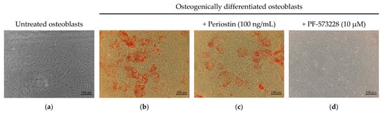 (a) Representative osteoblasts after two days of incubation without differentiation, (b) after 21 days of differentiation without additives, (c) after 21 days of differentiation with Periostin (100 ng/mL), and (d) after 21 days of differentiation with Periostin inhibition (PF-573228 at 10 µM), all visualized with alizarin red S staining.