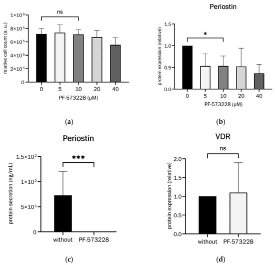 (a) Effects of PF-573228 concentrations on undifferentiated osteoblast viability (paired t-test, t = 0.2366, df = 2, p = 0.835 (ns), n = 3). (b) Effect of PF-573228 concentrations on Periostin protein expression in undifferentiated osteoblasts (paired t-test, t = 4.549, df = 4, p = 0.0104 (*), n = 5). (c) Effect of PF-573228 on Periostin secretion in 21-day-differentiated osteoblasts (Wilcoxon matched-pairs signed rank test, p = 0.001 (***), n = 11). (d) Effect of PF-573228 on Vitamin D receptor (VDR) expression in 21-day-differentiated osteoblasts (Wilcoxon matched-pairs signed rank test, p = 0.7334 (ns), n = 12).