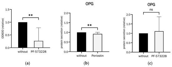 Effects of (a) Periostin inhibition (PF-573228 at 10 µM) on osteoblast differentiation, analysed with alizarin red S staining (Wilcoxon matched-pairs signed rank test, p = 0.0039 (**), n = 10) and (b) Periostin (100 ng/mL) and (c) Periostin inhibition (PF-573228 at 10 µM) on OPG secretion in 21-day-differentiated osteoblasts ((b): Wilcoxon matched-pairs signed rank test, p = 0.004 (**), n = 14, (c): Wilcoxon matched-pairs signed rank test, p = 0.5693 (ns), n = 12).