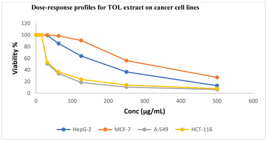 Dose–response profiles showing cytotoxic activity of TOL extract against investigated cancer cell lines.