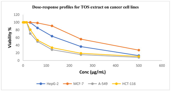 Dose–response profiles showing cytotoxic activity of TOS extract against investigated cancer cell lines.