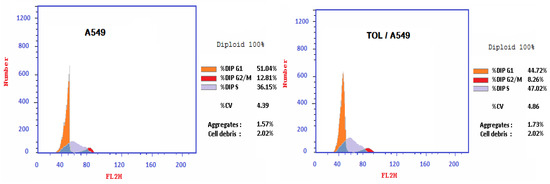 The percentage of A549 cancer cells in the S-phase rose when the TOL extract was applied, as seen in Figure 4 (47.2% compared to 36.15% in untreated cells). This increase in the percentage of cells in the S-phase relative to the control indicates that the TOL extract induces S-phase cell cycle arrest in the lung cancer cell line.