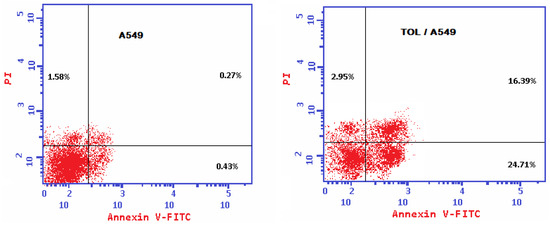 Using flow cytometry equipment and Annexin V-FITC kits (Thermo Fisher Scientific, Waltham, MA, USA) apoptosis in the A549 cells was examined. The Annexin V-FITC assay was used to further evaluate apoptotic cells. As instructed, the TOL extract was applied to grown A549 cells at its IC50 concentration (18.45 μg/mL). Following a 72 h treatment period, the A549 cells were collected, rinsed twice in PBS for 20 min each, and then rinsed with binding buffer.