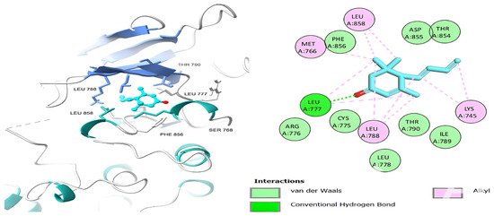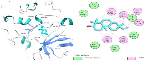Megastigmatrienone’s 3D and 2D molecular interactions with EGFR TK domain residues.
