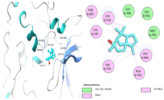 Cedrol’s Interactions with EGFR TK domain residues in two and three dimensions.