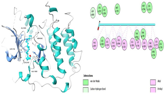 The EGFR TK protein was selected for the molecular docking study because it has the ability to be inhibited, which limits the growth pathway and offers a possible anticancer medication [54]. A lower binding energy resulting from the compound’s interaction with the intended protein indicates a higher binding efficiency. W19 acted as an EGFR TK inhibitor in this study.