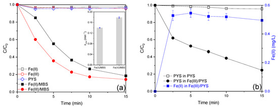 Furthermore, the performance of AO7 degradation in the Fe(III)/peroxygen (H2O2, PMS, and PDS) processes was examined. As exhibited in Figure S2, the decolorization efficiency of AO7 in the Fe(III)/peroxygen processes was less than 5%, indicating that the ability of Fe(III) to mediate the decomposition of the above three oxidants to generate reactive species is negligible [17]. Moreover, the Fe(III)/MBS process exhibited the best removal of AO7 compared with the Fe(III)/HSO3− process (83.2%) and Fe(III)/SO32− process (8.5%), which may be attributed to the differing pH levels of the solutions employed. The MBS solution was acidic, the sulfite solution was alkaline, and the bisulfite solution had a weakly acidic pH [19].