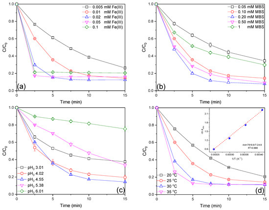 Effect of initial (a) Fe(III), (b) MBS concentration, (c) solution pH, and (d) reaction temperature on AO7 degradation efficiencies in the Fe(III)/MBS process (except for the investigated parameter, the other parameters were fixed at [AO7]0 = 0.02 mM, [Fe(III)]0 = 0.01 mM, [MBS]0 = 0.1 mM, T = 25 °C).