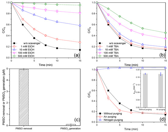 Effect of (a,b) radical scavengers and (d) dissolved oxygen on AO7 degradation efficiencies, and (c) PMSO removal, PMSO2 generation in the Fe(III)/MBS process (reaction condition: [AO7]0 = 0.02 mM or [PMSO]0 = 0.1 mM, [Fe(III)]0 = 0.01 mM, [MBS]0 = 0.1 mM, T = 25 °C).