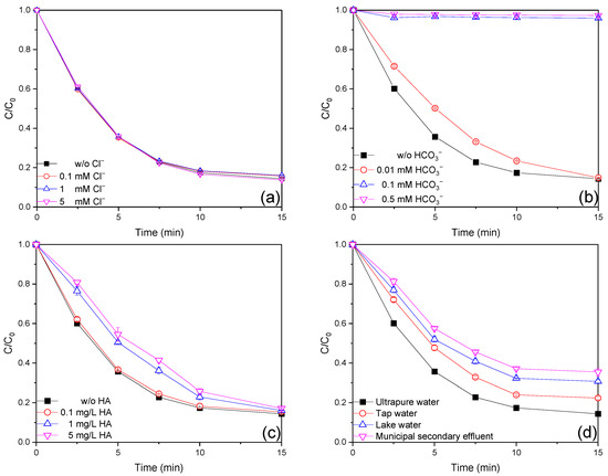 Effect of initial (a) Cl−, (b) HCO3−, (c) HA concentration, and (d) real water matrix on AO7 degradation efficiencies in the Fe(III)/MBS process (reaction condition: [AO7]0 = 0.02 mM, [Fe(III)]0 = 0.01 mM, [MBS]0 = 0.1 mM, T = 25 °C).