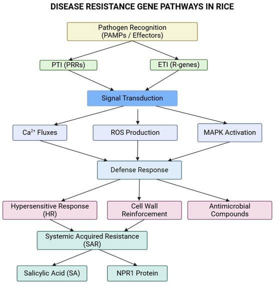 Plants have developed a two-tiered innate immune system to protect against pathogens. The first tier is triggered when cell surface pattern recognition receptors (PRRs) detect pathogen-associated molecular patterns (PAMPs), leading to PAMP-triggered immunity (PTI) involving MAP kinase, ROS production, and defense gene regulation, influencing pathogen virulence and ETI responses [23,24] (Figure 1). However, pathogens can overcome this defense by secreting effectors that inhibit PTI, resulting in effector-triggered susceptibility (ETS) [25]. To counteract this, plants activate the second tier of defense through the expression of resistance (R) genes. These R genes specifically recognize pathogen effectors and inhibit effector-triggered immunity (ETI) to combat infection effectively [25,26]. Developing disease-resistant rice varieties is a key strategy for safeguarding food security and ensuring sustainable rice production in the face of these challenges [27].