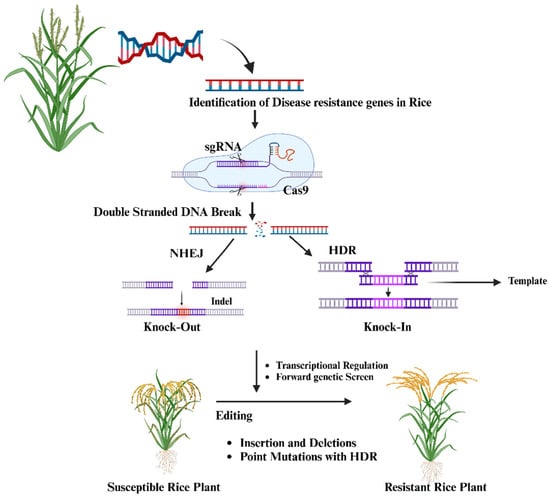 CRISPR/Cas9 technology has emerged as a transformative tool for enhancing disease resistance in rice, with a particular focus on combating bacterial blight caused by Xanthomonas oryzae pv. oryzae (Xoo) [60]. By targeting specific genes associated with disease susceptibility, researchers can introduce precise edits that either knock out or modify these genes, leading to improved resistance. The process involves designing a single-guide RNA (sgRNA) to direct the Cas9 protein to the target DNA sequence where it creates a double-stranded break [158]. This break is then repaired through either non-homologous end joining (NHEJ), which introduces indels that knock out the gene, or homology-directed repair (HDR) [158], which allows for precise modifications using a template (Figure 3). These edits result in rice plants with enhanced resistance to diseases such as bacterial leaf blight and rice blast [159]. By targeting susceptibility genes in rice, such as OsSWEET14, which Xoo exploits using transcription activator-like effectors (TALEs), CRISPR/Cas9 enables the modification of these vulnerable genetic sites [159]. These TALEs bind to specific promoter regions in OsSWEET14, facilitating infection and allowing the pathogen to redirect plant nutrients for its growth [160]. Research on Super Basmati rice employed CRISPR/Cas9 to disrupt the effector binding elements (EBEs) within the OsSWEET14 promoter, which TALEs like AvrXa7, PthXo3, and TalF recognize. By modifying these EBEs, scientists developed rice lines (SB-E1, SB-E2, SB-E3, and SB-E4) that are resistant to Xoo, thus preventing TALE binding and reducing bacterial blight incidence [161]. This resistance was validated by significantly shorter lesion lengths in edited plants relative to unmodified controls [162]. Thus, CRISPR/Cas9 not only enhances rice’s resilience to bacterial blight but also provides a method for creating disease-resistant rice varieties without introducing foreign genes, making it a valuable, sustainable tool for agriculture [163,164].