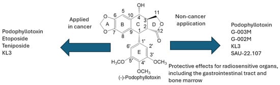 All the above-mentioned substances, which are derivatives of podophyllotoxin, are summarized in Figure 4. It categorizes them based on their activity: those with only anticancer effects, those with non-anticancer effects, and those exhibiting both types of activity.