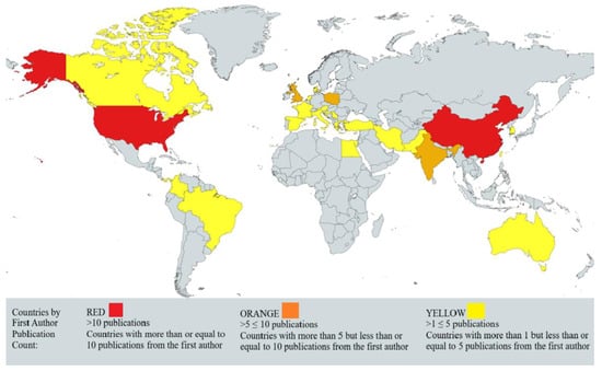 The map illustrates the geographical distribution of Podophyllotoxin (PPT) research based on the affiliation of the first author. The map was created using https://www.mapchart.net/ (accessed on 19 January 2025).
