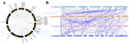 Colinearity analyses of CNGC genes. (A) Colinearity analyses in C. clementina; (B) Colinearity analyses in C. clementina, C. sinensis, P. trifoliata, and A. thaliana.