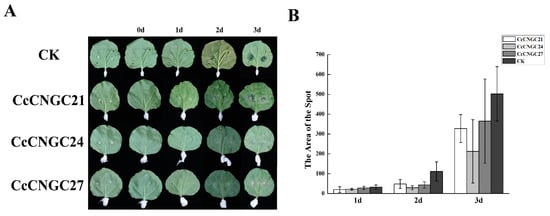 The symptoms of the tobacco leaves after infection with P. nicotianae in transient transformation CcCNGC21, CcCNGC24, and CcCNGC27. (A) Phenotypic changes of tobacco leaves; (B) The area of the spot used ImageJ.